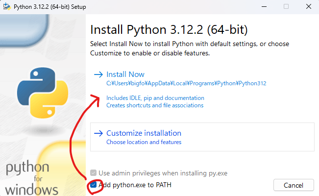 次に下記のような画像が表示されます。一番下の「Add python.exe to PATH」にチェックを付けて
